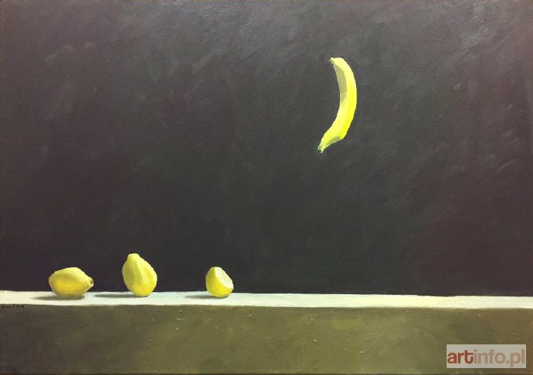 sygnowany, datowany i opisany na odwrociu: 'BANAN LEWITUJĄCY 2017 | Jarosław Łukasik | 65 x 92 cm | olej na płótnie', na odwrociu nalepka autorska.