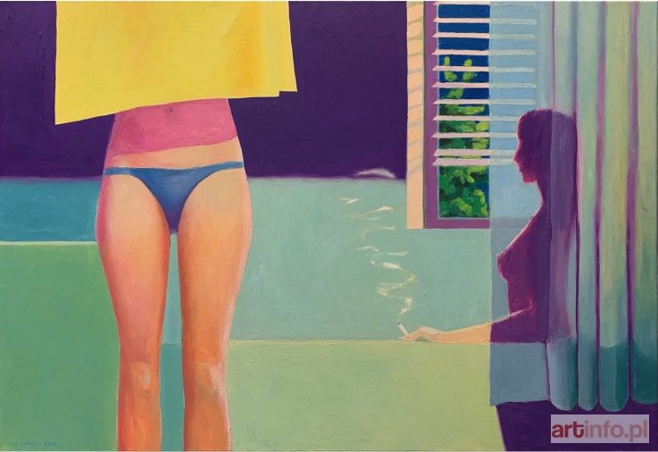 sygnowany, datowany i opisany na odwrociu: ' „ONE W ŁAZIENCE” | Jarosław Łukasik 2019r. | olej na płótnie | 70 x 100 cm'