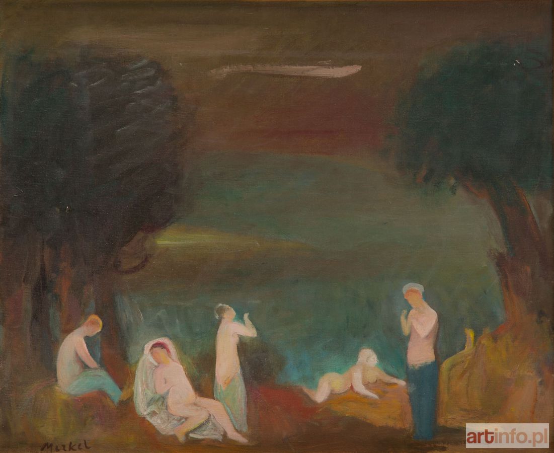 Jerzy Merkel artystyczną edukację odebrał w krakowskiej Akademii Sztuk Pięknych (1903-06), a potem przebywał w Paryżu w latach 1908-14. Jego twórczość wiąże się przede wszystkim ze sceną sztuki Wiednia, gdzie mieszkał do 1938, oraz Paryża. We Francji, w Paryżu i Cagnes- -sur-Mer, działał do 1972, aby następnie osiąść w Wiedniu, gdzie zmarł w 1976. Był członkiem Hagenbundu, ważnego secesyjnego ugrupowania z początku wieku, oraz artystycznej kolonii w Zwinkenbach. Wiele razy wystawiał w miastach Europy i Stanów Zjednoczonych oraz otrzymywał państwowe odznaczenia francuskie i austriackie w dziedzinie malarstwa. Formatywnym okresem jego twórczości był pobyt w Paryżu na początku wieku, gdzie zetknął się ze dziełami francuskich mistrzów, hołdujących klasycyzmowi w sztuce i kulturze. Szczególny wpływ wywarły nań postaci Nicolasa Poussina, Claude’a Lorraina oraz Pierre’a Puvis de Chavannes’a. Merkel, zainspirowany nimi, wytworzył osobisty styl, w którym rezygnował z przestrzenności, eksponując płaszczyznę płótna, operował geometrycznymi formami, opartymi na precyzyjnym rysunku, oraz używał matowej, harmonijnej palety barwnej. Często podejmował tematykę związaną z macierzyństwem czy rodziną, a także chętnie malował sielankowe wizje Arkadii, w których doskonale wybrzmiewał klasycyzm jego twórczości.
