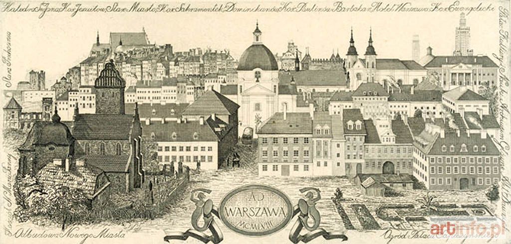 "Panorama Warszawy", 1958. Miedzioryt, 16 x 30,5 cm w świetle passe-partout. Sygnowany pod płytą ołówkiem l.d. "miedzioryt", p.d. "Jerzy Miller". Oprawa. Jerzy Miller - absolwent warszawskiej ASP, uprawiał grafikę warsztatową (głównie miedzioryt) i użytkową (znaczki pocztowe, pocztówki, ilustracja książkowa). Był projektantem papierów wartościowych, m.in. autorem rysunku układu słonecznego na rewersie banknotu 1000 złotowego. Wystawa indywidualna artysty odbyła się w Warszawie w 1964 roku.