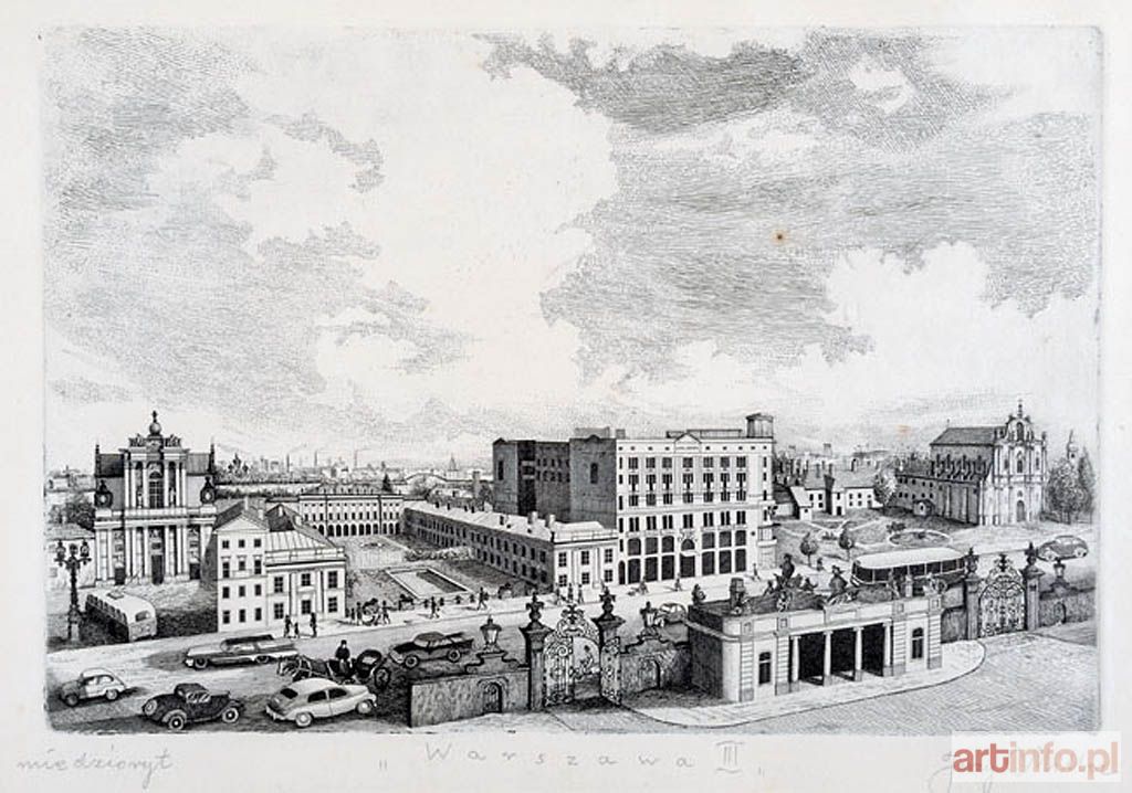 "Warszawa III", 1960 [Krakowskie Przedmieście]. Miedzioryt, 22,5 x 32 cm. Sygnowany pod płytą ołówkiem: l.d. "miedzioryt", "Warszawa III" [pośrodku], p.d. "Jerzy Miller". Grafika reprodukowana m.in. w katalogu wystawy "Muzeum Polskie w Ameryce. Zbiory graficzne". Kraków 2008 MN, w kat. poz. 67. Oprawa.