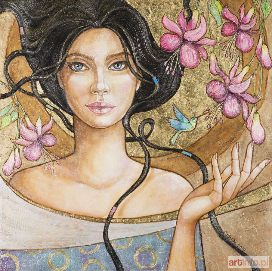 Olej, akryl, szlagmetal, płótno, 80 x 80 cm, sygn. p.d.: J. Misztal 2019.