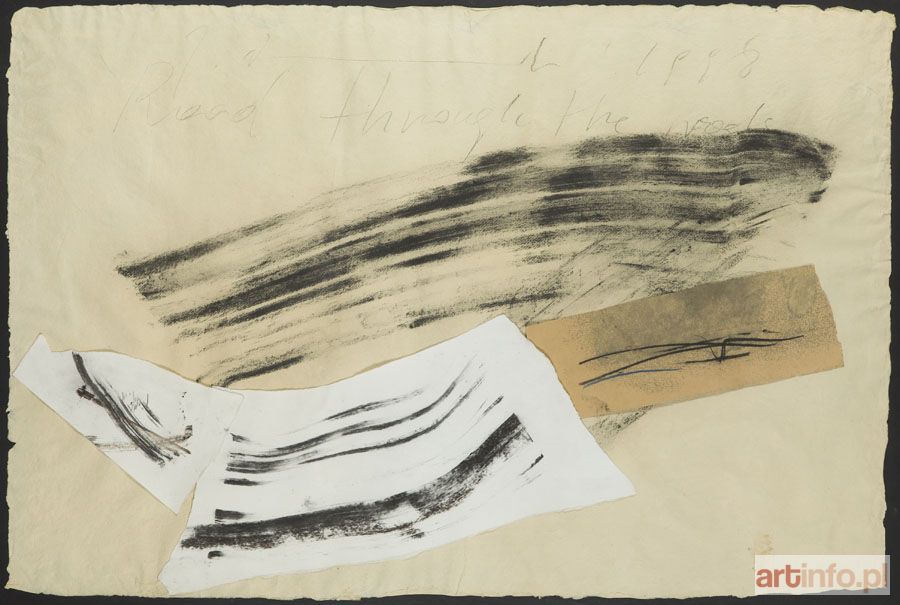 collage, ołówek, węgiel/papier, 70 x 105 cm sygnowany, datowany i opisany u góry: '[sygnatura] 1998 | Road trough the roads'