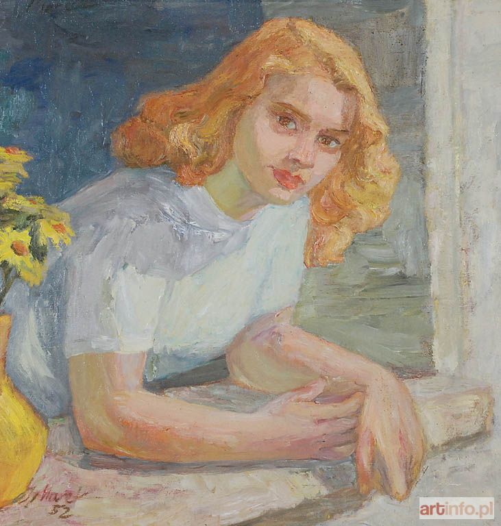 na odwrocie napis: Józef Marek 1952 / "Dziewczyna w oknie" oraz podpis: Marek