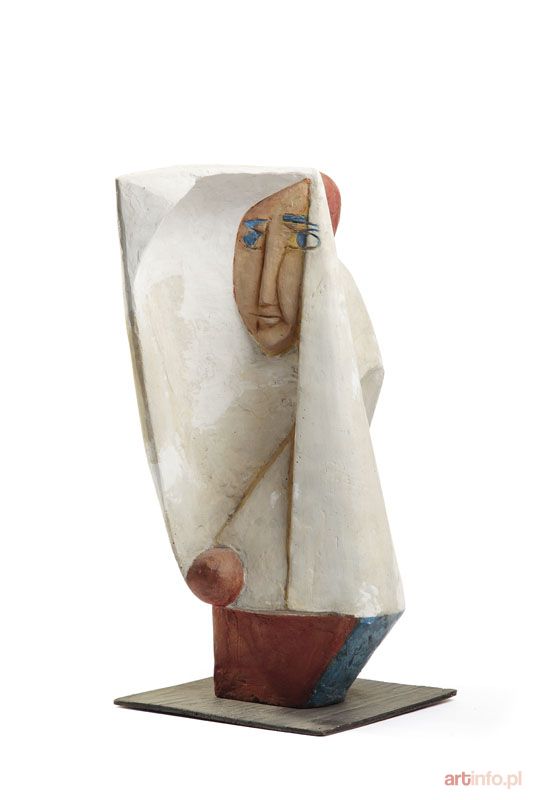 gips polichromowany, drewno, wys.: 40 cm, dł.: 19 cm sygnowany oraz tytuł autorski na sodzie: `Portret w białym welonie` | `Józef Marek` LITERATURA: Józef Marek lata 50. i 60., katalog wystawy, Kraków 2005, il. s. 5 WYSTAWIANY: Józef Marek, lata 50. i 60., 23.06. - 08.07.2005 Nautilus, Kraków
