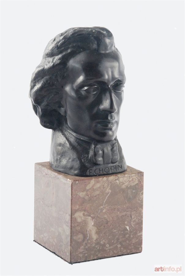 Głowa kompozytora na kubicznej podstawie z beżowo-różowego marmuru. Z przodu napis: "F. CHOPIN"; z boku sygnatura: "Markiewicz" oraz znak odlewnika: "WMiecznik / WARSZAWA". Józef Markiewicz - utalentowany medalier, rzeźbiarz i poeta - swoje prace - medale, rzeźby - często poświęcał Chopinowi, którego wielbił od dzieciństwa.