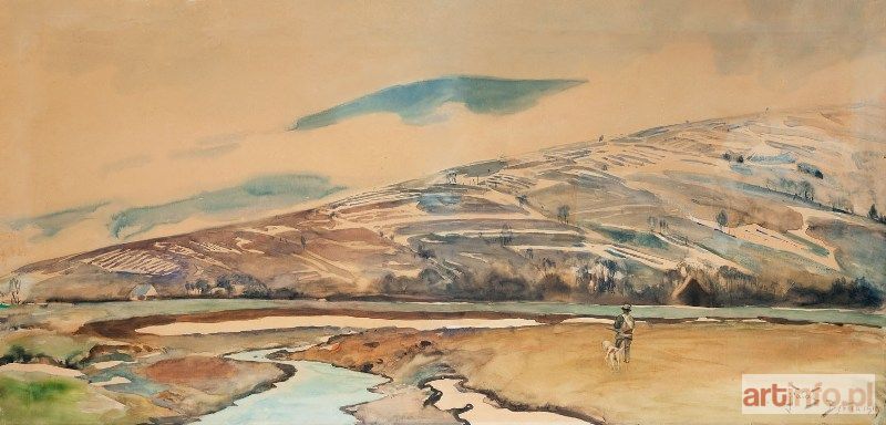 akwarela/papier, 67 x 147 cm sygnowany i datowany p. d.: `j.Fałat | Bystra 1919` obraz po dawnej konserwacji
