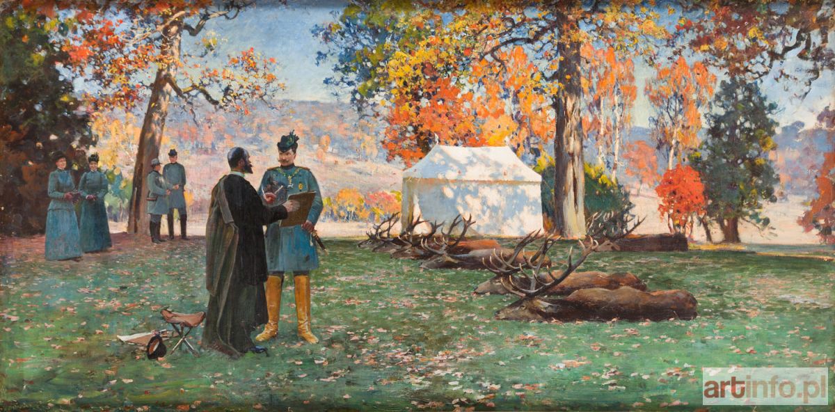 Prezentowana "cesarska" praca została opisana w Fałatowskich "Pamiętnikach": "Cesarz nabył kilka moich obrazów większych i - zaraz po polowaniu - wiele mniejszych; natomiast najlepszy mój obraz, zaprezentowany mu w roku 1898, skrytykował słowami 'Zu modern!' ['Zbyt nowoczesny']. Mówiąc o nim, spoglądał na malowane kasztany w jesiennym ubarwieniu czerwono-żółtym i w oświetleniu słonecznym; wskazując na jedno z najczerwieńszych drzew, powiedział: 'An diesem Baum kann man ja die Zigarre anzünden' ['Od tego drzewa mogę cygaro zapalić']. Odpowiedziałem, że jest to dla mnie największy komplement - i zaczęła się dyskusja nad różnicą krajobrazów, malowanych przed i po latach siedemdziesiątych. (...) Obraz wspomniany pozostał więc moją własnością - i dzisiaj patrzę z radością na te śliczne pejzaże jesienne z Hubertusstock, malowane modernistycznie. (...) O niekupienie obrazu nie miałem najmniejszych pretensji, bo w gruncie rzeczy malowałem zawsze dla siebie i miałem nagrodę w radości tworzenia" (Julian Fałat, dz. cyt., s. 194-95).