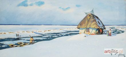 Motyw chaty rybackiej na brzegu rzeki w zimowej, słonecznej aurze podejmował Julian Fałat wielokrotnie dokonując drobnych zmian w sztafażu. Prace powstały ok. 1915 roku, gdy artysta zamieszkał już w Bystrej pod Żywcem. Zwykle opatrywał je pod sygnaturą nazwą "Nieśwież", co stanowiło wyraz reminiscencji dawnych pobytów w posiadłości Radziwiłłów w Nieświeżu, bywało, że ten sam motyw podpisywał "Bystra".