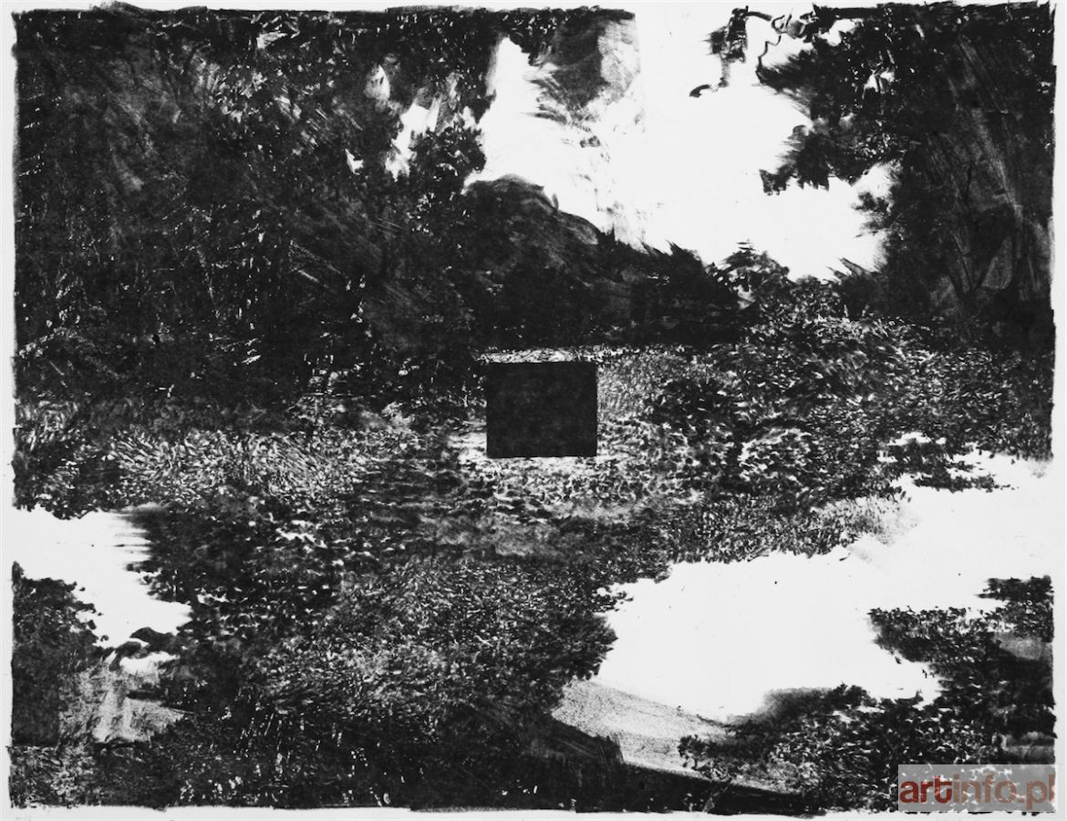 Praca inspirowana filmem Antonioniego Blow up. Czarny prostokąt w środku kompozycji zasłania narzędzie zbrodni lub jej skutki.