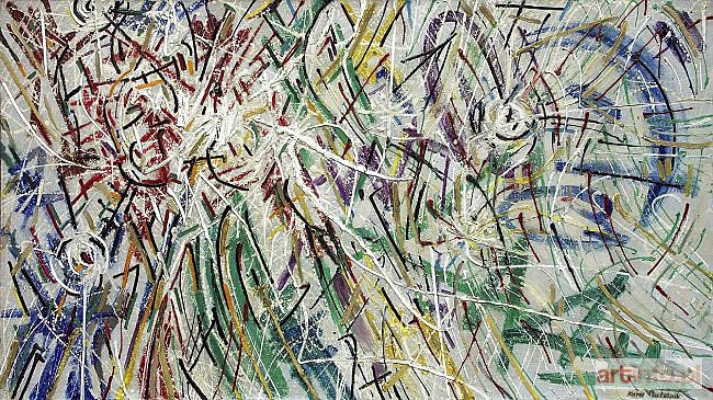 olej na płótnie, 72,5 x 130 cm sygn. p.d.: Karol Pustelnik ; na odwrocie: Pustelnik Karol 1956 , na blejtramie: Kwitnienie 1956 Wyst.: CBWA oddział w Krakowie; Galeria Krzysztofory