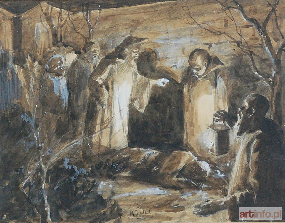 tusz lawowany, gwasz na podrysowaniu ołówkiem, tektura, 29,3 x 37,5 cm (w świetle oprawy); sygn. pośrodku u dołu: K Żelech Na odwrocie orzeczenie stwierdzające autentyczność obrazu Leszka Ludwikowskiego z 1978 r.