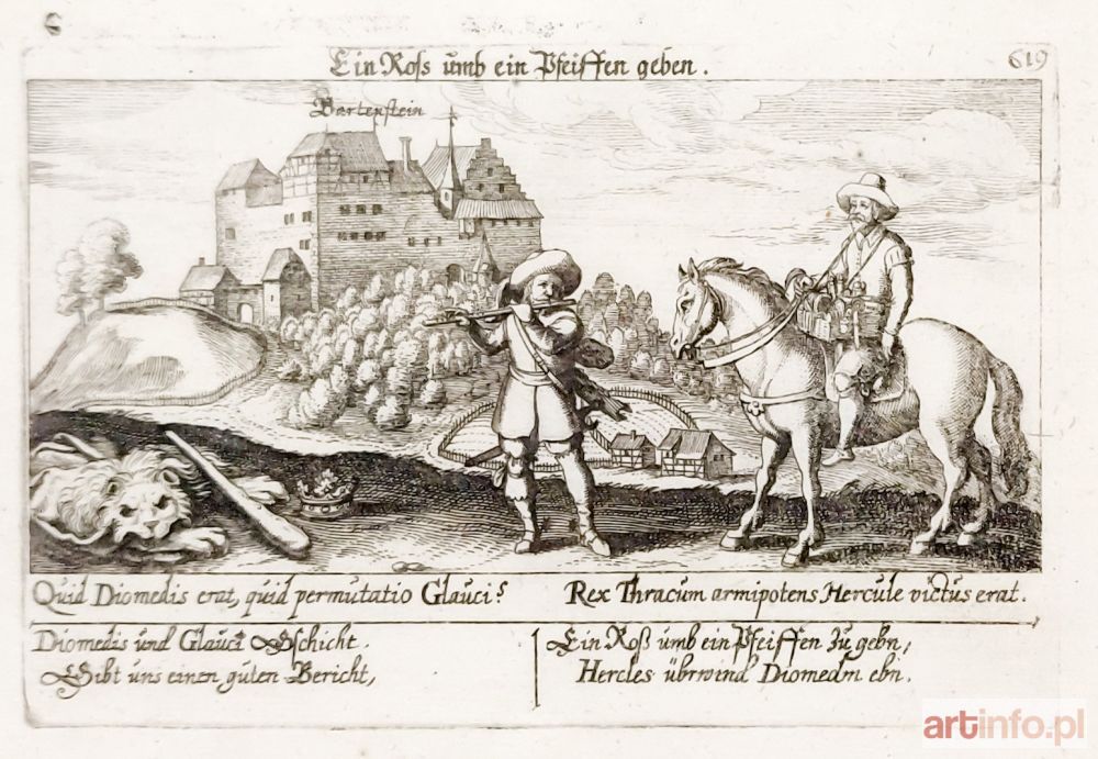 Widok na zamek krzyżacki, pochodzi z: Meissner, Daniel, Thesaurus Philopoliticus, wyd. Eberhard Kieser, Frankfurt n. Menem, 1621-1631; nad górną ramką: Ein Ross umb ein Pfeiffen geben; pod dolną ramką sentencje w jęz. łacińskim i niemieckim; miedz. cz.-b., st. bdb., niewielki ślad wilgoci na górnym marginesie, passe-partout; wymiary płyty: 149x98 mm; Bartenstein;