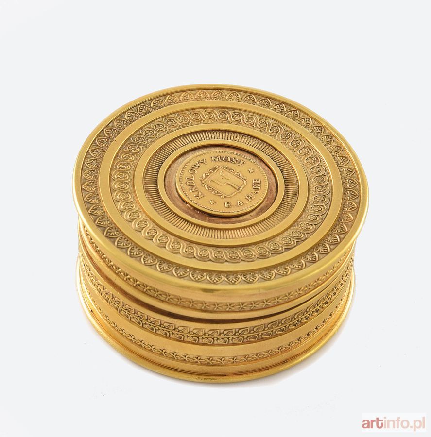 Cylindryczna puszka, zapewne z zestawu toaletowego, zdobiona pasami moletowanego ornamentu z motywem sznura, plecionki z rozetkami, palmetek, gwiazdek i stylizowanej wici o sercowatych listkach. Na pokrywce pośrodku moneta dominialna k z kartuszem herbowym i napisem w otoku: „KRÓLOWY MOST E. A. HAKE”.