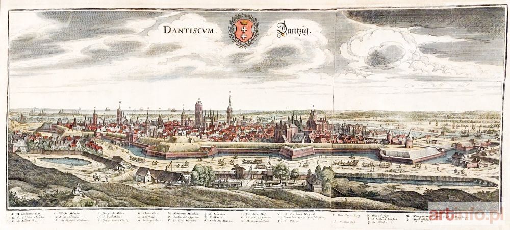 Panorama miasta z Biskupiej Górki (od południowego zachodu), kopia panoramy Gdańska Aegidiusa Dickmanna, wykonana ok. 1640 r. przez Matthäusa Meriana; pochodzi z: Zeiller, Martin, Topographia Electoratus Brandenburgici et Ducatus Pomeraniae, wyd. Spadkobiercy Matthäusa Meriana, Frankfurt n. Menem 1652; pod dolną ramką legenda; miedz. kolor., st. bdb., po fachowej konserwacji, zdublowany na papierze, ślady złożeń; wymiary płyty: ok. 480x220 mm; DANTISCVM. / herb miasta / Dantzig; [Dantiscum... G101/1]