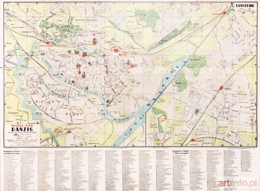 Plan Gdańska w 1940 r., lit. i odbił Pharus-Gutenberg, wyd. Pharus-Verlag G.m.b.H., Berlin 1940; poniżej wykaz ulic; podziałka 1: 8000; na verso reklamy oraz nieaktualna pieczęć własnościowa; chromolit., st. bdb., po fachowej konserwacji, zdublowana na bibule, wielokrotne złożenia, minimalne rozdarcia i przetarcia na złożeniach; wymiary planu: 647x370 mm; PHARUS-PLAN / DANZIG;