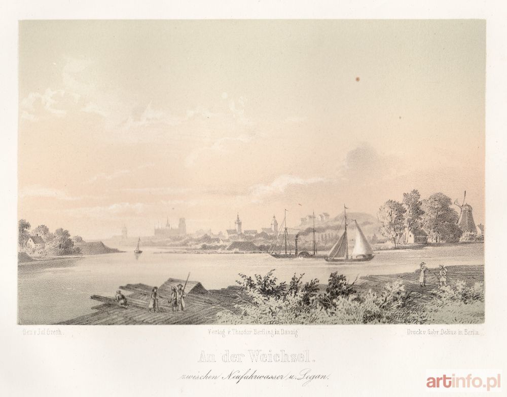 Widok na Wisłę pomiędzy Nowym Portem a Legan (obecnie część dzielnicy Młyniska), rys. i lit. Julius Greth, odbili bracia Delius w Berlinie, wyd. Theodor Bertling, Gdańsk, ok. 1860; chromolit., st. bdb., minimalne zażółcenia krawędzi, kilka niewielkich plamek; wymiary widoku: 194x127 mm; An der Weichsel. / zwischen Neufahrwasser u. Legan; RZADKIE!