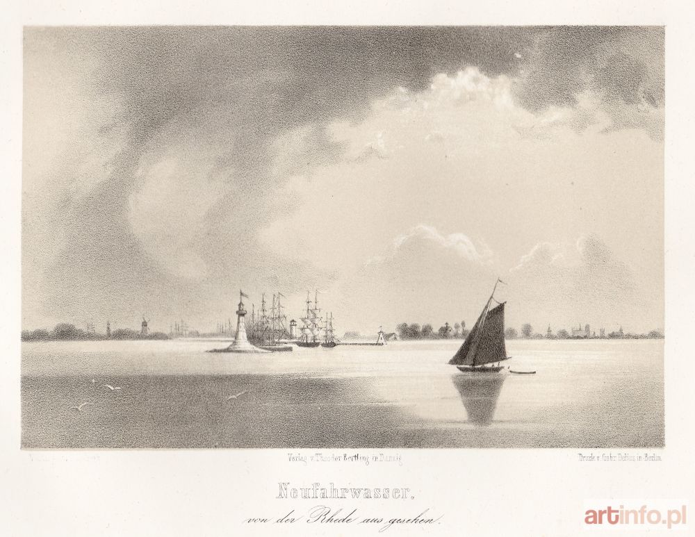 Widok Nowy Port z redy, rys. i lit. Julius Greth, odbili bracia Delius w Berlinie, wyd. Theodor Bertling, Gdańsk, ok. 1860; lit. tonowana, st. bdb., minimalnie zażółcone krawędzie; wymiary widoku: 193x127 mm; Neufahrwasser. / von der Rhede gesehen; RZADKIE!