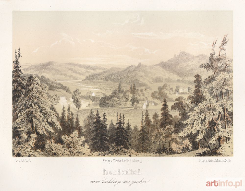 Widok na Dolinę Radości, rys. i lit. Julius Greth, odbili bracia Delius w Berlinie, wyd. Theodor Bertling, Gdańsk, ok. 1860; chromolit., st. bdb., minimalne zażółcenia krawędzi, niewielka żółtawa plamka na lewym marginesie; wymiary widoku: 192x127 mm; Freudenthal. / vom Carlsberge aus gesehen; RZADKIE!
