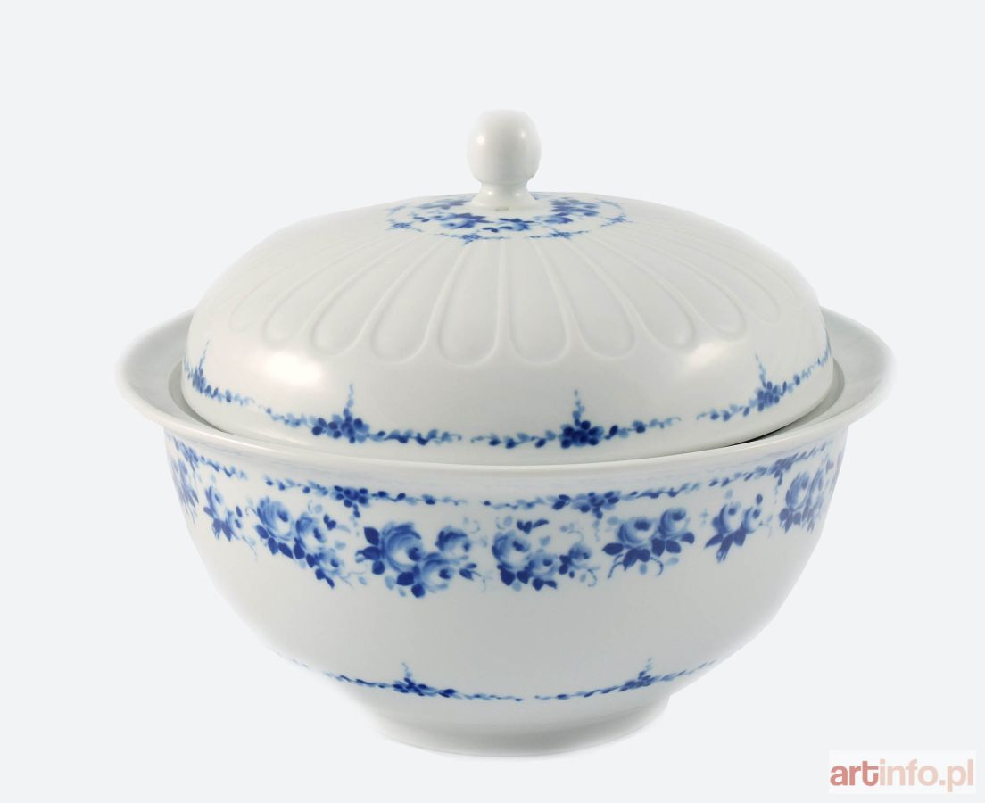 Waza do zupy z pokrywką porcelana, kalka podszkliwna; wys. całk. 20 cm, średn. 25,5 cm; oznaczenia na spodzie kobaltem podszkliwnie: Henneberg Porzellan / MADE IN GDA / ECHT KOBALT. NRD.