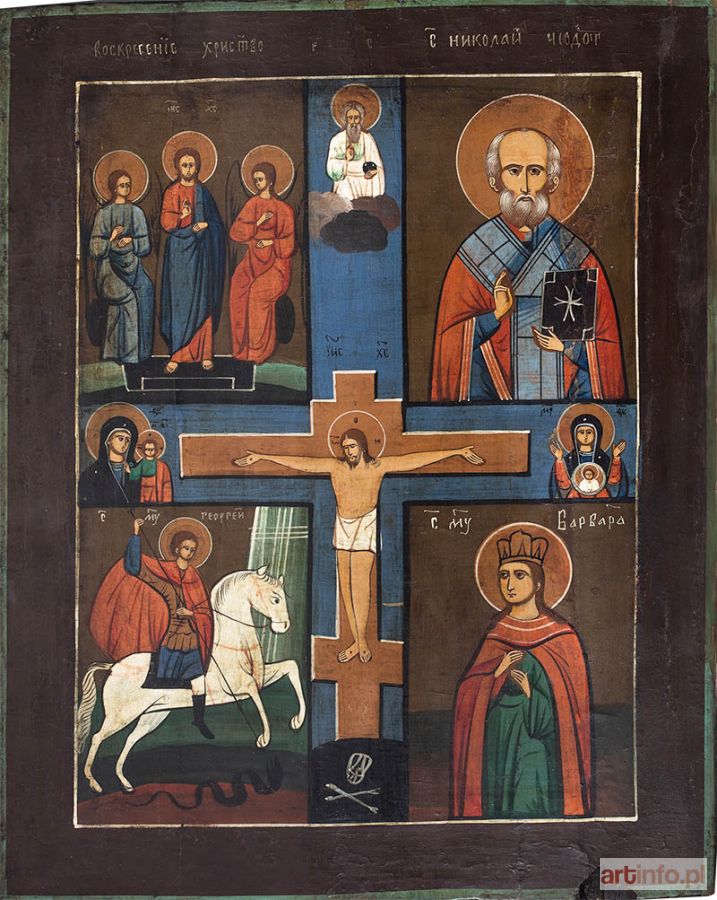 tempera, drewno, 50 × 40 cm, w czterech kwaterach wizerunki: Chrystusa z Aniołami, Św. Mikołaja, Św. Jerzego oraz Św. Barbary, centralnie Chrystus Ukrzyżowany, w ramionach „krzyża”: Bóg Ojciec, Matka Boska Kazańska i Matka Boska Znamienije