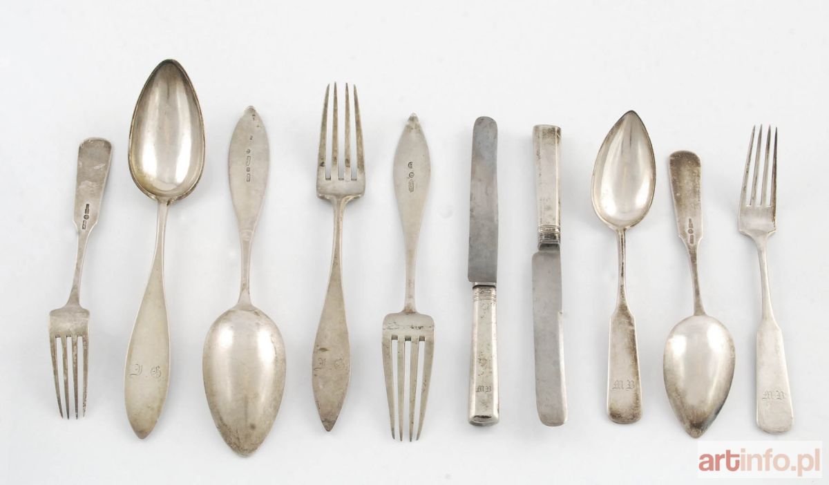 Zestaw sztućców składający się z 9 łyżek do bulionu (dł. 19,2 cm), 10 noży i 10 widelców do przystawek (dł. 20,5 cm i 18,7 cm) oraz 7 łyżek do zupy (dł. 23 cm) i 6 widelców do drugiego dania (dł. 21,7 cm); srebro próby 84 cechowane (Malcz, kotwica, cecha probierni z datą 1866 i próbą 84) oraz próby 12 cechowane (Malcz,12, w/Warszawie, znak warsztatowy, Z1851; duże widelce - ERadke,12, znak warsztatowy); waga 1707 g (bez noży). Warszawa, 1866 ; widelce i noże do drugiego dania - lata 30.- 40. XIX w.
