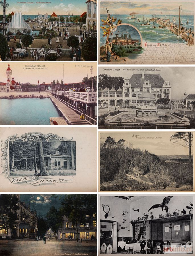 1. Ulica Morska nocą, zdjęcie z ok. 1910 r., 8,7 x 13,8 cm, z obiegu 2. Widok na II Dom Zdrojowy nocą oraz na molo, wyd. Kunstanstalt J. Miesler, Berlin, 9,2 x 13,9 cm, z obiegu (1900) 3. Wnętrze restauracji Rats-Struben, 9,1 x 13,8 cm 4. Restauracja Wielka Gwiazda na rozstaju leśnych dróg (Grosser Stern), zdjęcie z ok. 1895 r., M. Schröter, Gdańsk, 9,3 x 13,8 cm, z obiegu (1902) 5. Przechadzka leśna w Sopocie, 8,7 x 13,9 cm 6. Kurhaus z 'Tanecznym kręgiem' w centrum, 8,8 x 13,9 cm 7. Kurhausterassen, 1923 r., Stengel & Co., Drezno, 8,8 x 13,6 cm, z obiegu 8. Widok na Zakład Balneologiczny i molo, 8,9 x 13,5 cm
