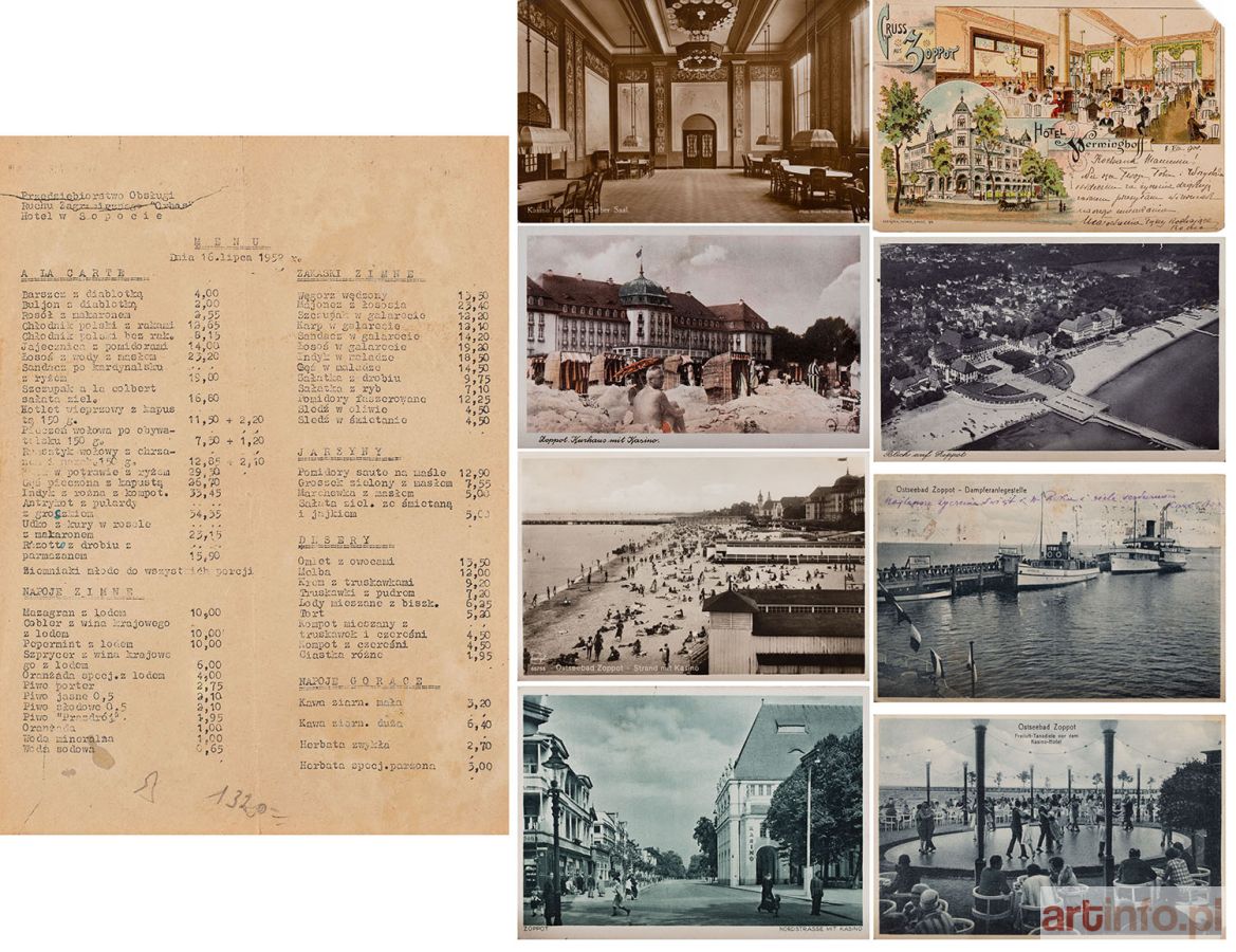 1. Płyta muzyczna przed Kasino Hotel, koniec lat 20. XX w., 8,9 x 14 cm, Stengel & Co., Drezno, bez obiegu 2. Widok na Kasino Hotel z perspektywy plaży, po 1927 r., 8,9 x 14 cm, Verlag S. Steinmeyer, Gdańsk, bez obiegu 3. Kasino Hotel i Kurhaus z lotu ptaka, 1938 r., 9 x 14,1 cm, Carl Lange, Gdańsk-Oliwa, z obiegu 4. Pocztówka wieloelementowa Hotel Werminghoff widziany od strony ul. Północnej oraz sala restauracyjna we wnętrzu hotelu, litografia z 1899 r, wyd. GEBRUDER ZEUNER, Gdańsk, ok. 1900 r., z obiegu 5. Widokówka Dampferanlegestelle, 1930 r., 9,1 x 14 cm, Hermann Gonschorowski, Sopot, z obiegu 6. Wnętrze kasyna w Sopocie, Sala Żółta, zdjęcie Bruno Machtans, Gdańsk, ok. 1925 r., wyd. C. Ziemssens Buchhandlung, Sopot, 8,8 x 13,6 cm, bez obiegu 7. Kasyno widziane od strony dzisiejszej ul. Powstańców Warszawy, Verlag Heinrich Hoffmann, Posen, 10,1 x 14,7 cm, z obiegu (1943) 8. Grand Hotel oraz kasyno widziane z perspektywy plaży, Stengel & Co., Drezno, 8,8 x 13,5 cm, z obiegu 9. Menu z Grand Hotelu (Orbis), z dnia 16 lipca 1952 r., 30 x 21 cm