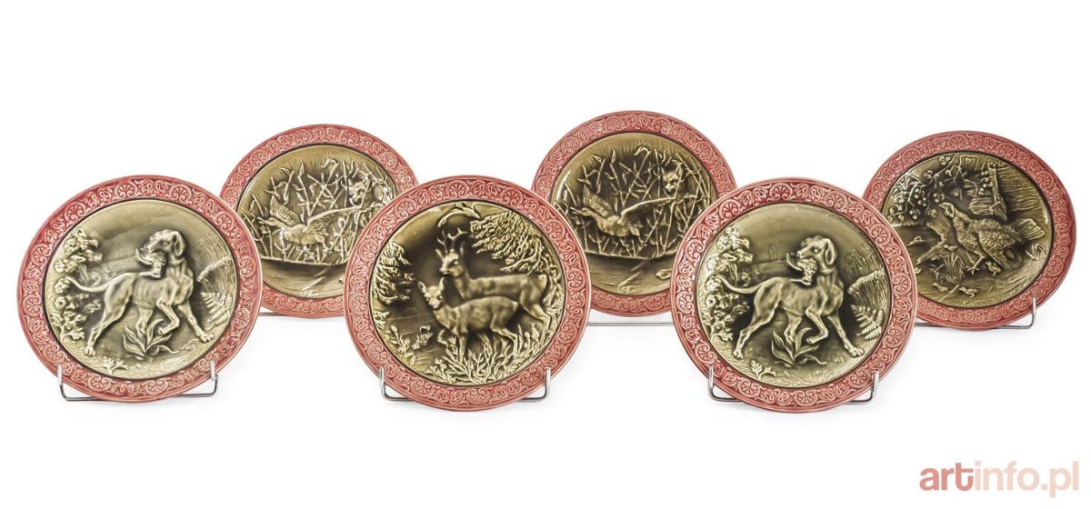 w komplecie 6 talerzy; fajans zdobiony reliefowo, wąski ornamentalny kołnierz, w lustrze motywy myśliwskie (pies z kaczką (2 szt), kaczka zrywająca się do lotu (2 szt.), kuropatwy (1 szt), jelenie (1 szt); u spodu punca wyciskana w masie (V&BS w okręgu,