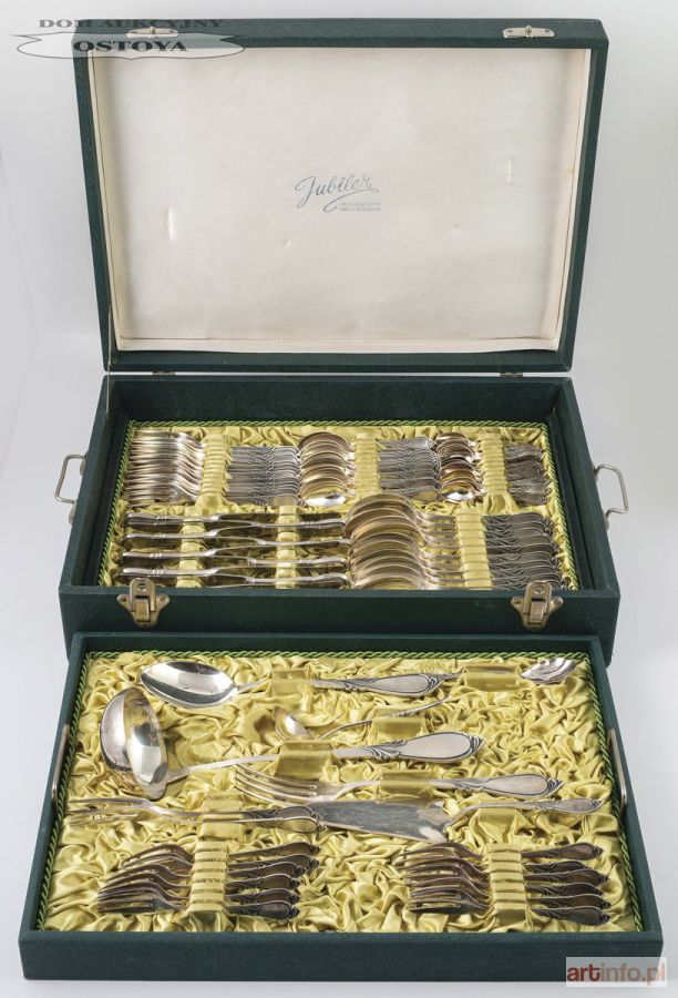 Srebro, próba 3, stal nierdzewna (ostrza noży), waga bez noży 2898 g, w składzie po 12 noży, łyżek, widelców, łyżeczek, łyżeczek do kawy, widelczyków do ciasta, serwingowe: łyżka do cukru, łyżka i widelec półmiskowe, łyżka wazowa, łopatka do ciasta, para widelców do wędlin, czerpak do sosu; razem 80 sztuk