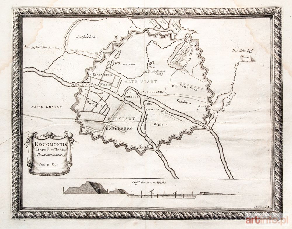 Plan obwarowań miasta, ryt. Francois de Lapointe, rys. Erik Jönson Dahlberg; w dole profil terenu; pochodzi z: Pufendorf, Samuel, Histoire Du Regne De Charles Gustave Roy De Svede..., wyd. Christoph Riegel, Norymberga 1697; miedz. cz.-b., st. db., passe-partout, złożenie książkowe, zażółcenia papieru, w górnych narożnikach symetryczne ślady wilgoci; wymiary płyty: 317x251 mm; REGIOMONTIS / Borußiae Urbis / Nouae munitiones; [Dahlbergh... 63, Von Danzig... 124, Kartografia... 33]