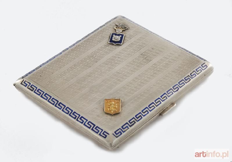 Papierośnica z herbem Jastrzębiec srebro próby 2 cechowane, częściowo złocone, emalia; wys. 1,5 cm, szer. 10 cm, głęb. 8,5 cm; waga 150 g. Warszawa, ok. 1932