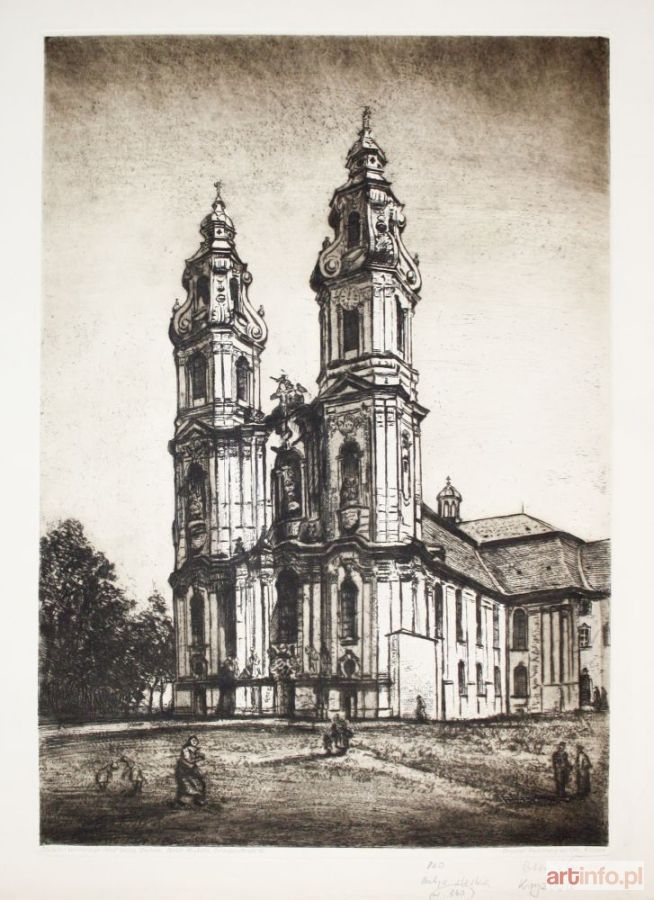 Opactwo cysterskie, rys. i ryt. Otto Küssow (w dole odręczna sygn. autora), wyd. Adolf Weiss, Berlin, okres międzywojenny; akwf. tonowana, st. bdb., na marginesach nieznaczne naddarcia, zagniecenia i lekkie zabrudzenia; wymiary płyty: 382x545 mm; bez tyt.;