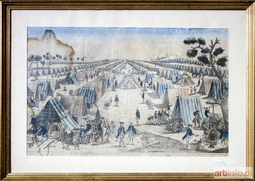 Wojska pruskie w obozie pod Lęborkiem, anonim, Paryż, ok. 1750; miedz. kolor., st. db., z lewej str. rozlega plama, lekkie przetarcia, zabrudzenia, nieznaczne zagniecenia, rama i szkło; wymiary w świetle passe-partout: 405x257 mm; tyt. pod dolną ramką: Vuë du Camp de L'armé Prussienne dessinée sur le naturel dans la pleine de Lonwenborg en Pomeranie;