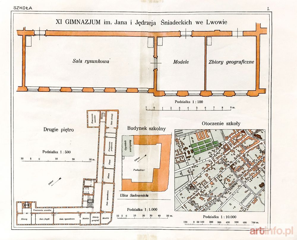 Plany XI Gimnazjum im. Jana i Jędrzeja Śniadeckich we Lwowie (C.K. II Państwowa Szkoła Realna, podczas I wojny światowej w roku szkolnym 1917/1918 przeniesiona do nowo wybudowanego gmachu przy ul. Szymonowiczów, a po odzyskaniu przez Polskę niepodległości przemianowana na XI Państwowe Gimnazjum im. Jana i Andrzeja Śniadeckich we Lwowie), anonim, okres międzywojenny; arkusz przedstawiający trzy plany ogólne budynku szkoły i mapę jej otoczenia; druk kolor., st. db., po konserwacji, w środkowej części ślad klejenia, na verso rys. ołówkiem; wymiary widoku: 305x255 mm; XI GIMNAZJUM im. Jana i Jędrzeja Śniadeckich we Lwowie;