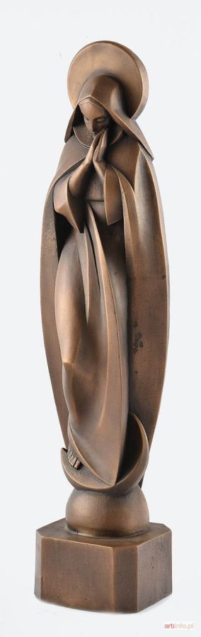 Matka Boska stojąca na kuli ziemskiej, pod Jej bosą stopą - półksiężyc. Nad głową nimb, ręce złożone do modlitwy. Forma kubizująca, fałdy szat geometrycznie ciosane. Odlew z pierwotnej rzeźby drewnianej; z tyłu na prostopadłościennej podstawie o ściętych narożach nr odlewu: „1/8”.