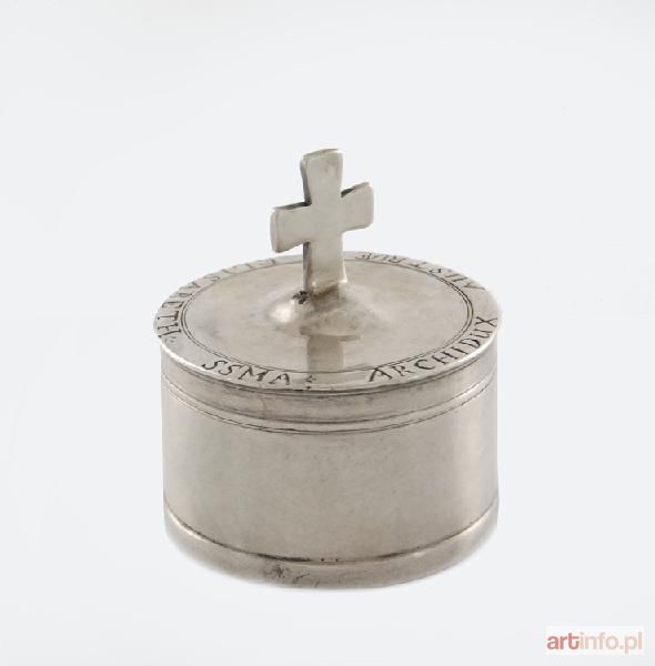 srebro niecechowane; wys. 4 cm, średn. 3,7 cm; waga 48 g. na wieczku wygrawerowana inskrypcja: ELIZABETH SSMA ARCHIDUX AUSTRIAE; Austria?, 1 poł XVIII w. Naczynie należało do Arcyksiężnej Elżbiety (1691-1750) matki cesarzowej Marii Teresy.