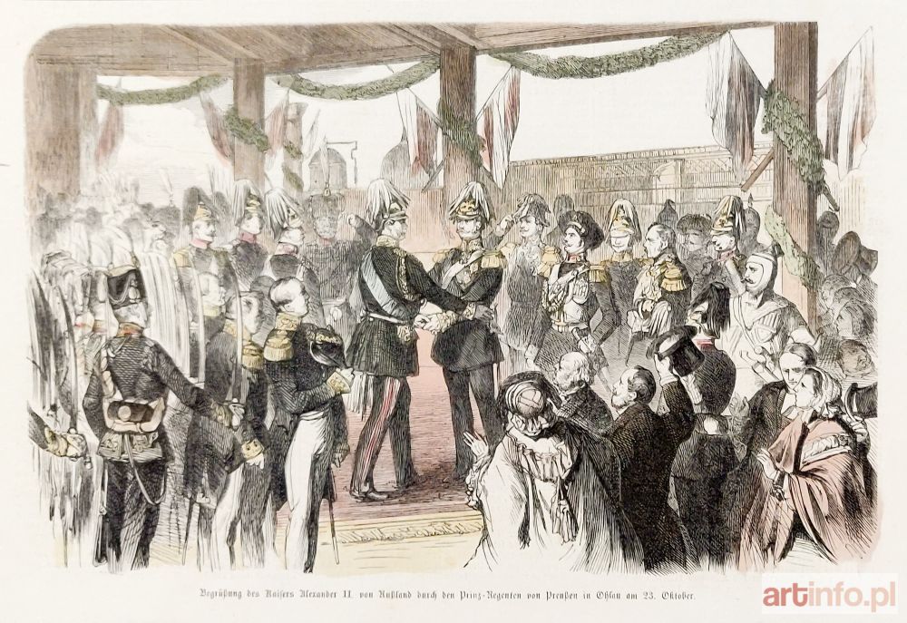 Spotkanie Aleksandra II z cesarzem Wilhelmem, pochodzi z: Illustrirte Zeitung, 12 XI 1859; drzew. szt. kolor., podklejony tekturą, st. bdb.; wymiary: 240x155 mm; Begrüßung des Kaisers Alexander II von Rußland durch den Prinz-Regenten von Preußen in Ohlau am 23. Oktober;