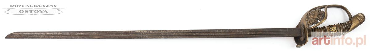 Stal, brąz, drewno, biały metal, dł. całk. 83 cm Na jelcu godło Wenezueli i napis: Independcia Libertad 5 de Julio 1811 28 de Marzio 1864 Dios y Fedo Na rękojeści monogram RdeV Na głowni trawiony napis: (…) 1900 Na głowni u nasady wybite: głowy króla i rycerza Stan: głownia skrócona, brak skóry na rękojeści