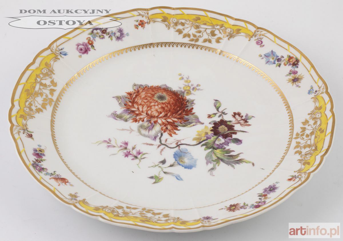 Model: Żółty Serwis Fryderyka Wielkiego dla Zamku Poczdamskiego, 1771 Porcelana, farby naszkliwne, złocenia; śr. 35 cm Sygnowany kobaltem podszkliwnie: berło; czerwonym drukiem: jabłko królewskie nad literami KPM; wyciskiem: 3 1 W; czarną farbą: 13/16; 63