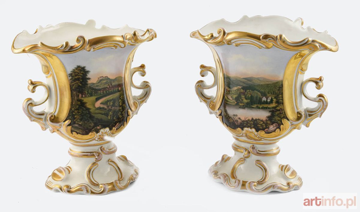 Wazki neobarokowe, o spłaszczonych 2-stronnie brzuścach, rozchylonych krawędziach i wydzielonych przewężeniem stopkach modelowanych reliefowo wolutami roślinnymi z podobnymi, esowatymi uchwytami z boków. Na brzuścach dwustronnie barwne miniatury z widokami pejzażowymi z architekturą i sztafażem, umieszczone w złoconych ramkach: