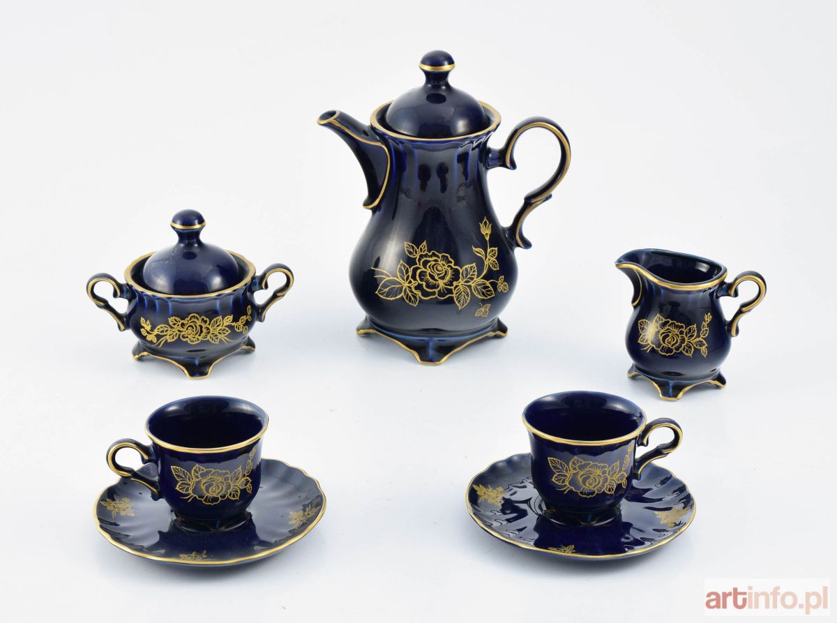 w składzie: 6 filiżanek: wys. 5,5 cm; 6 spodeczków: średn.12,5 cm; mlecznik: wys. 8 cm; cukiernica z pokrywką: wys. 9,5 cm; dzbanek z pokrywką: wys. 20 cm;