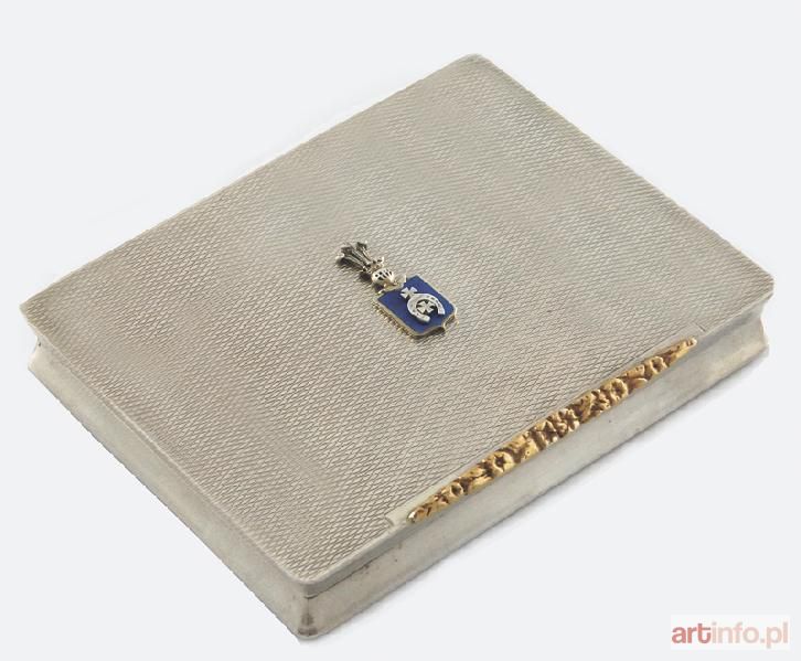 srebro próby 830 częściowo złocone, cechowane (punca z literą S), emalia; wys. 1,2 cm, szer. 8,5 cm, głęb. 7 cm; waga 112 g. Szwecja, lata 20.-30 XX w.