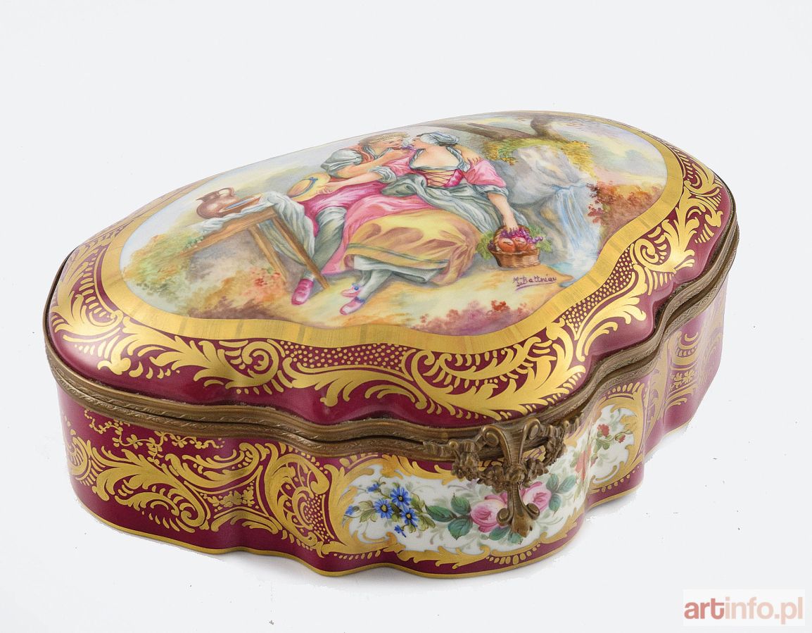 Wiśniowe, owalne puzdro o profilowanych ściankach bocznych, z lekko wysklepioną pokrywą w oprawie metalowej na zawiasach, z dźwigienką do otwierania. W złoconej rezerwie na wieku barwna miniatura, sygn: p. d. M. Battréau: w pejzażu ze strumykiem flirtująca para: dziewczyna z koszyczkiem z owocami i obejmujący ją kawaler; z lewej stół z misą i dzbanem. Wokół miniatury na wieku i bocznej ściance złocony ornament roślinny, od frontu na puzdrze rezerwa z kompozycją kwiatową.
