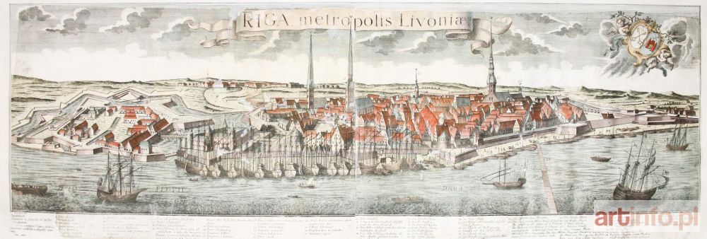 Rozległa panorama miasta z zaznaczonymi ważniejszymi budynkami, rys. F.I. Saur, wyd. Georg Balthasar Probst, Augsburg, ok. 1754; rzadki, czwarty stan panoramy z serii zapoczątkowanej rysunkami Friedricha Bernharda Wernera; dodano herb miasta, kilka statków oraz dwujęzyczną, łacińsko-niemiecką legendę; w prawym dolnym rogu nota wyd.: Georg Balthasar Probst, excud. Aug. Vind.; w prawym górnym rogu herb miasta; miedz. kolor., odbity z 2 płyt, pod dolną ramką legenda, st. db., po gruntownej konserwacji, odtworzono dwa fragmenty legendy łącznie z nieznacznymi, przylegającymi do dolnej krawędzi fragmentami panoramy, w obrębie panoramy uzupełniono perforacje oraz pęknięcia; wymiary widoku: 1115x333 mm; tyt. na falującej wstędze, na tle nieba: RIGA, metropolis Livoniae; BARDZO EFEKTOWNE!