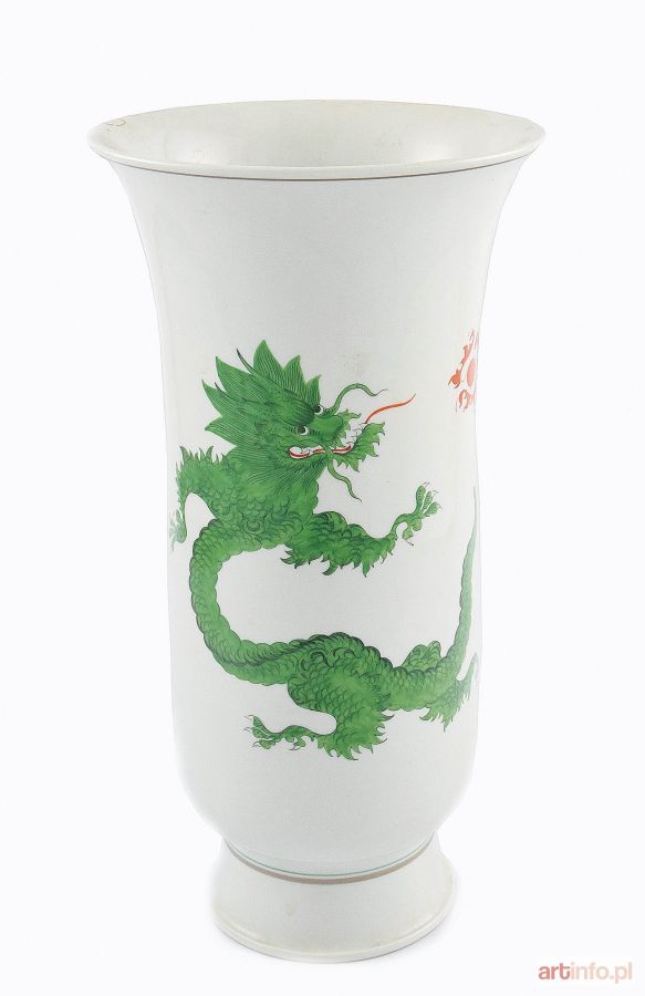 Cylindryczny wazon o lekko rozchylonej krawędzi i stopce wydzielonej uskokiem; na brzuścu zielony chiński smok, trzy koliste ceglaste motywy ornamentalne i zielono- ceglasty motyw 4-dzielny.Swobodne nawiązanie do historycznego miśnieńskiego wzoru mit roten Drachen.