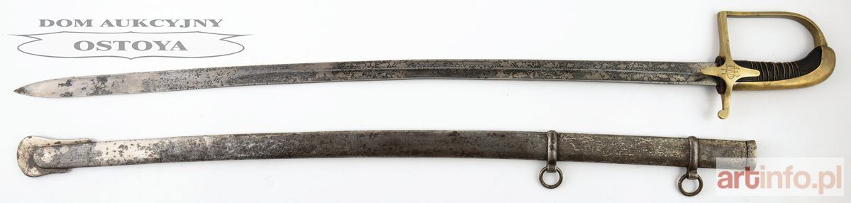Stal, niklowanie, mosiądz, drewno, skóra, dł. całk. w pochwie 95 cm, bez pochwy 91 cm, głowni 78,5 cm, Głownia na zewnętrznym płazie trawiona: wiś roślinna Orzeł, napis: Honor i Ojczyzna Na wewnętrznym płazie u nasady wybite: G.Br / WARSZAWA Na zewnętrznym wąsie wyryty monogram: WD