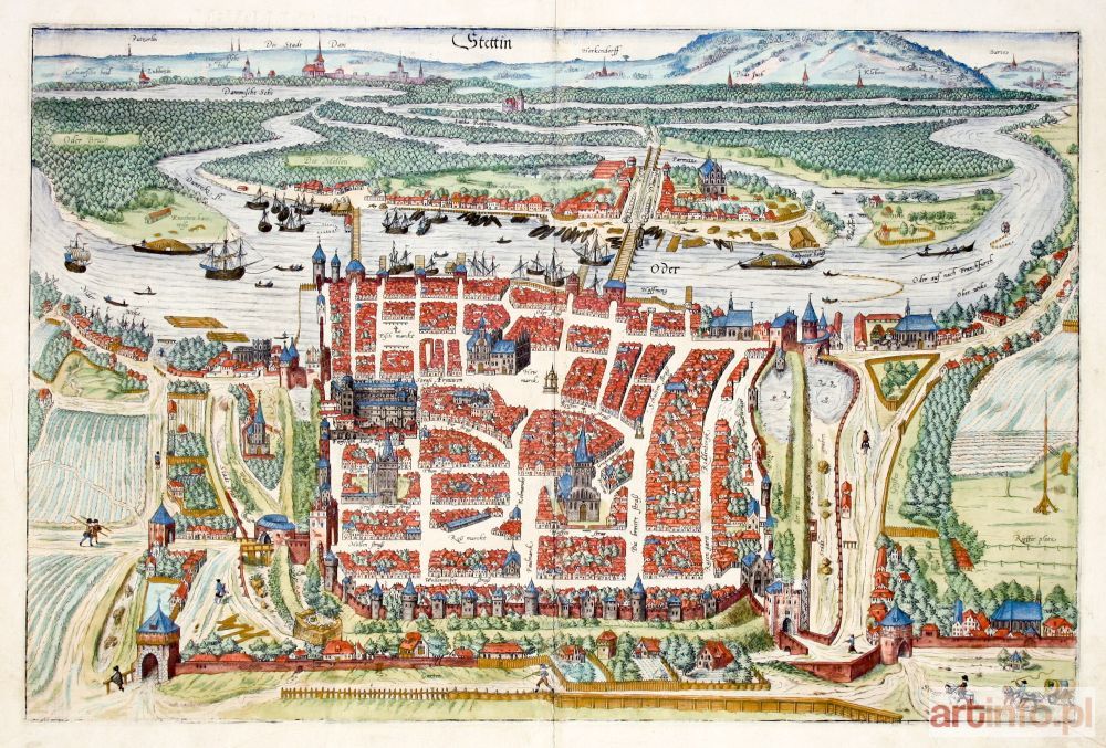 Perspektywiczny plan miasta – niezwykle rzadko spotykana edycja, która została szybko zastąpiona nową wersją (zatytułowaną Alten Stettin), pochodzi z IV tomu Civitates Orbis Terrarum, oprac. Georg Braun, Frans Hogenberg, Kolonia 1588; na verso tekst w jęz. łacińskim: STETINVM; miedz. kolor., st. bdb., nieznaczne zabrudzenia, passe-partout; wymiary płyty: 502x333 mm; tyt. w górze, na tle nieba: Stettin; [Widoki Szczecina... str. 76-87] OGROMNA RZADKOŚĆ!