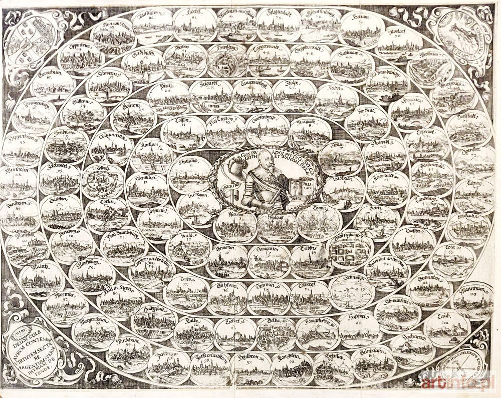 Widoki 103 miast i terytoriów na terenie ówczesnego cesarstwa niemieckiego opanowanych przez Gustawa Adolfa w trakcie wojny trzydziestoletniej; wszystkie widoki ponumerowane i rozmieszczone w formie ślimaka, rozwijającego się wokół centralnie umiejscowionego portretu Gustawa Adolfa;