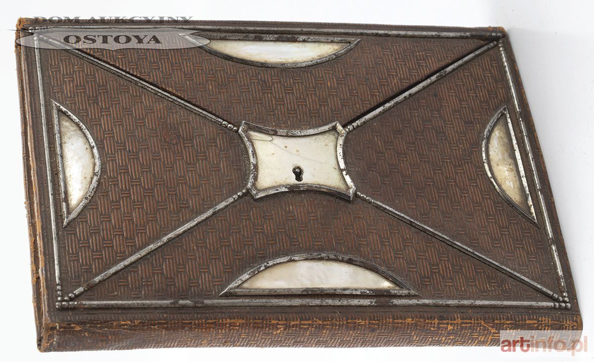 Obwoluta: tłoczona skóra ze stalowymi, niklowanymi okuciami i inkrustacjami masą perłową, 17,5 x 13 cm Wewnątrz 55 czystych kart o złoconych krawędziach